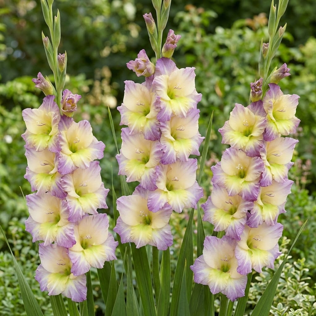 NOVITA’ Un gladiolo dal fascino etereo e sofisticato, con fiori bicolori unici che fondono il giallo crema con sfumature lilla-viola e un tocco di verde lime al centro. Porta una luce lunare e misteriosa nelle bordure estive e nei bouquet più raffinati.