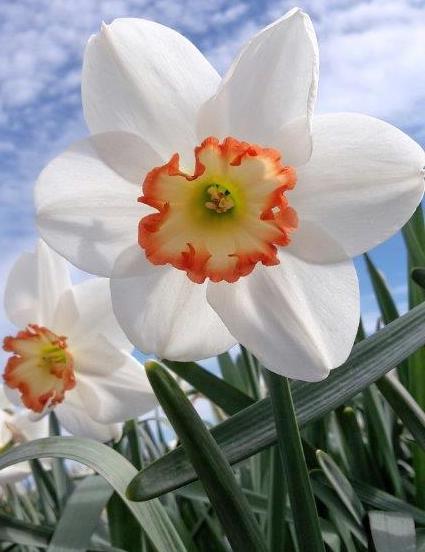 Tepali bianchi e corona di media dimensione bianco crema con un bellissimo bordo rosa. Splendida pianta molto alta. Fioritura intermedia.